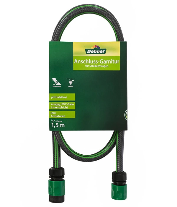 Mit der Dehner Anschluss-Garnitur für Schlauchwagen haben Sie die perfekte und praktische Verbindung zu allen gängigen Schlauchwagen und -trägern. Ganz unkompliziert und kinderleicht können Sie dieses Schlauchteil mit Ihrem vorhandenen Set kombinieren. Lästiges Entwirren und Auslegen gehören endgültig der Vergangenheit an. Dank der Dehner Anschluss-Garnitur können Sie sich über entspanntes Bewässern ganz ohne Verwinden und Verdrehen freuen. Gießen wird so zu einem entspannten Vergnügen.