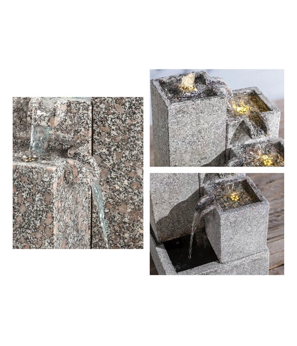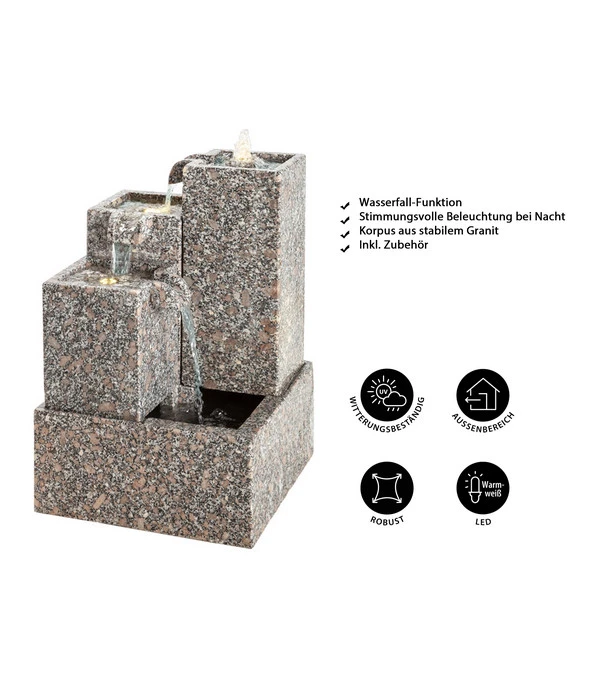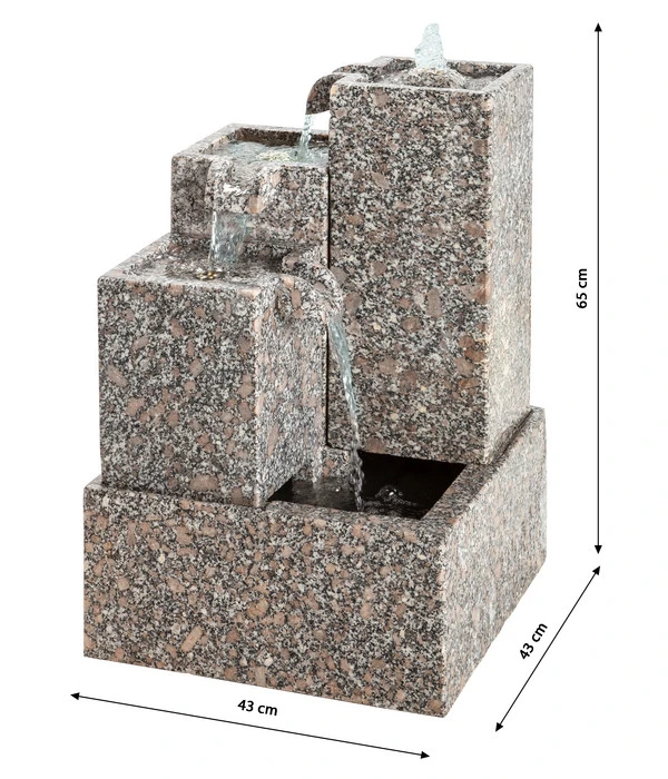 Da beim Gartenbrunnen Cascada neben den Granit-Elementen auch die Pumpe, Trafo und die LED-Beleuchtung im Lieferumfang eingeschlossen sind, steht einem schnellen Aufbau nichts im Wege. Der Gartenbrunnen Cascada kann übrigens den ganzen Winter über im Freien stehen bleiben. Allerdings sollten Sie darauf achten, dass er vor Frostbeginn vollständig entleert ist.