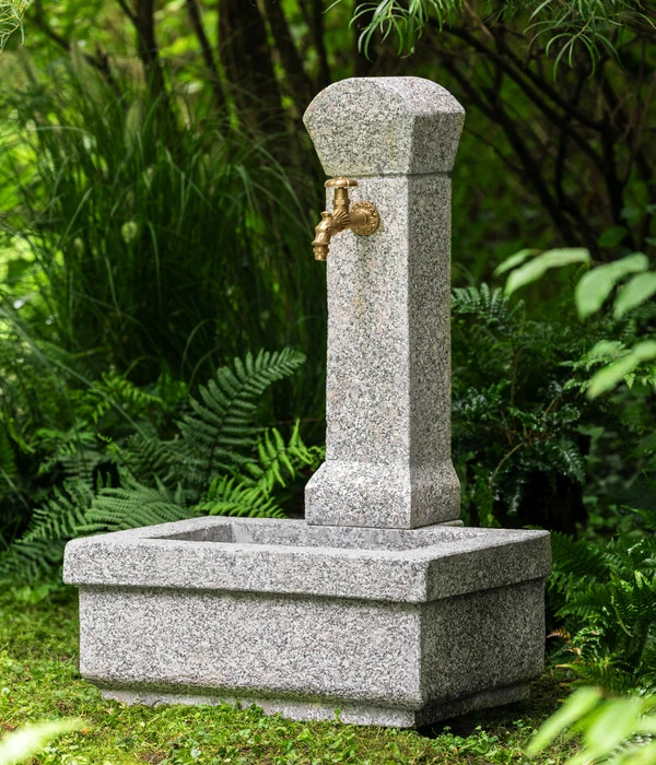 Brunnen faszinieren uns Menschen seit jeher. Waren sie doch früher Kennzeichen für eine lebenswichtige Sache: Wasser. In vielen Gärten waren sie als Wasserentnahmestelle zu finden und begegnen uns heute noch in unterschiedlichster Form. Am Marktplatz rege genutzt, als Kunstwerk mit in Stein gebannten Szenen oder als Wasserstelle mitten in der Stadt. Der Dehner Granit-Gartenbrunnen Linz könnte sich ganz nahtlos in diese Reihe eingliedern. Denn auch von seiner Art hat man heute gerne ein Exemplar im Garten stehen. Allerdings hat sich der Zweck gänzlich verändert. Der edle Brunnen wurde aus massivem Granit gefertigt, in geradlinig modernem Design gestaltet und in einer imposanten Größe ausgearbeitet. Aus seinem goldfarbenen Drachenkopf-Wasserhahn plätschert unablässig das Wasser ins Becken. Ein äußerst angenehmes Geräusch, das unsere Gedanken bei längerer Betrachtung in eine andere Welt abschweifen lässt. Schnell stellt sich hier Entspannung ein, die durch die Freude über die dekorative Errungenschaft noch intensiviert wird. Der Dehner Granit-Gartenbrunnen Linz eignet sich für den direkten Anschluss an die Wasserleitung oder an eine Pumpe. Der Brunnen ist leicht aufzubauen, es muss nur noch der Wasserhahn angeschraubt werden, da die Rohre im Brunnen bereits verbaut sind.
