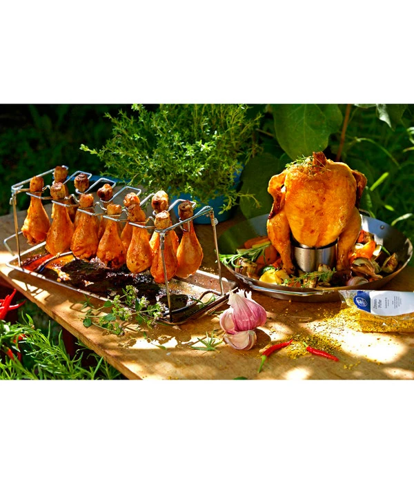 Jetzt ist die Gelegenheit, eine große Familien- oder Freundesrunde zur fröhlichen Chicken-Wings-Party-einzuladen, denn ab jetzt sind Sie der stolze Besitzer eines Dehner Markenqualität Hähnchenkeulenhalter! Sie meinen, Hühnerkeulen und Chicken Wings haben Sie auch sonst schon zubereitet? Das mag sein, aber noch nie wurde der amerikanische Grill-Klassiker so köstlich knusprig, wie mit dem Dehner Markenqualität Hähnchenkeulenhalter. Denn anders als früher liegen die Keulen im Dehner Markenqualität Hähnchenkeulenhalter nicht in einer Grillschale oder auf einem Rost, sondern sie hängen. Da leuchtet es jedem ein, dass die Hähnchenhaut im Dehner Markenqualität Hähnchenkeulenhalter besonders kross wird, nicht wahr? Und ab jetzt müssen Sie auch keine Scheu mehr vor vielen hungrigen Mäulern zu haben, denn auf dem Dehner Markenqualität Hähnchenkeulenhalter passen bis zu 12 Hähnchenschenkel! Noch ein Tipp für alle, die Kinder haben: servieren Sie doch beim nächsten Kindergeburtstag statt Würstchen knusprige Chicken Wings von Ihrem Dehner Markenqualität Hähnchenkeulenhalter. Die Herzen der Kinder werden Ihnen zufliegen!