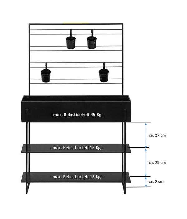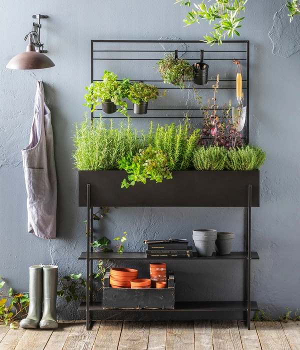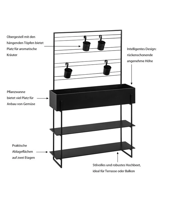 Die Leidenschaft zum Gärtnern bringt manchmal ein kleines Leiden im Rücken mit sich. Doch das Hochbeet Provence schafft hier Abhilfe. Nutz- und Zierpflanzen können Sie nun in angenehmer Arbeitshöhe pflanzen und pflegen. Die Aufteilung des aus pulverbeschichtetem Metall gefertigten Hochbeets ist schlichtweg genial. Zwei Etagen im unteren Bereich dienen als praktische Ablagefläche für Erde, Saatgut, Harke und Pflanzspaten. Der große Pflanzkasten ist schnell mit Erde befüllt und eignet sich für Blumen Ihrer Wahl: Entscheiden Sie Sich doch für eine saisonal wechselnde Bepflanzung oder naschen Sie von den köstlichen Erdbeeren, die Sie in das Beet gepflanzt haben. Das Obergestell des Hochbeets Provence mit den hängenden Töpfen wiederum bietet Platz für aromatische Kräuter wie Rosmarin, Basilikum und Minze. Bestellen Sie online einfach das Hochbeet und die gewünschten Pflanzen und Utensilien gleich mit.