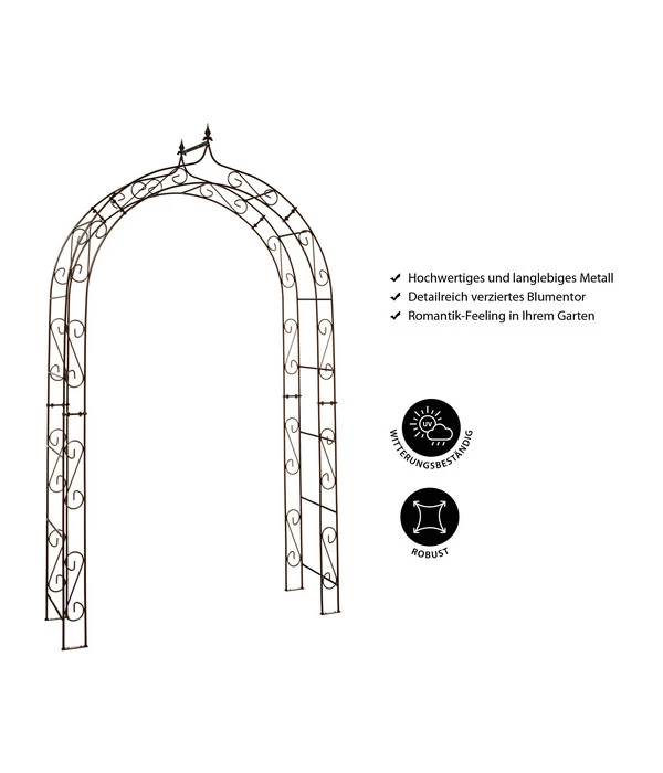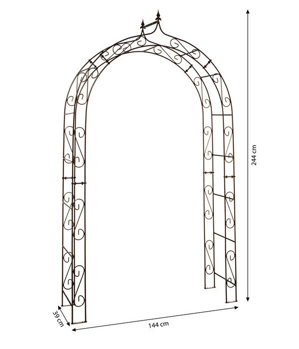 Ist er nicht einfach eine Augenweide? Mit seiner klassischen Rundung und den liebevoll gestalteten Spitzen wirkt der Rosenbogen Jasmin wie die schon in der viktorianischen Zeit so beliebten Bögen. Man kann sie noch heute in englischen Parks und Gärten bewundern. Wenn Sie sich für dieses ganz besonders schöne Stück entscheiden, wird ein hochwertiges Accessoire Einzug in Ihrem Garten halten, das Potential für viele, viele Jahre hat, denn der Rosenbogen wurde aus verzinktem Metall hergestellt. Eine hochqualitative Verarbeitung, die ihn stabil, äußerst robust sowie UV-, frost- und wetterbeständig macht. Für seine angenehm warme Ausstrahlung wurde er mit einem zusätzlichen „Topping“ versehen: einer Pulverbeschichtung in kupferbraun. Dass er sich ganz einfach und schnell aufbauen lässt, erleichtert die Entscheidung zusätzlich.