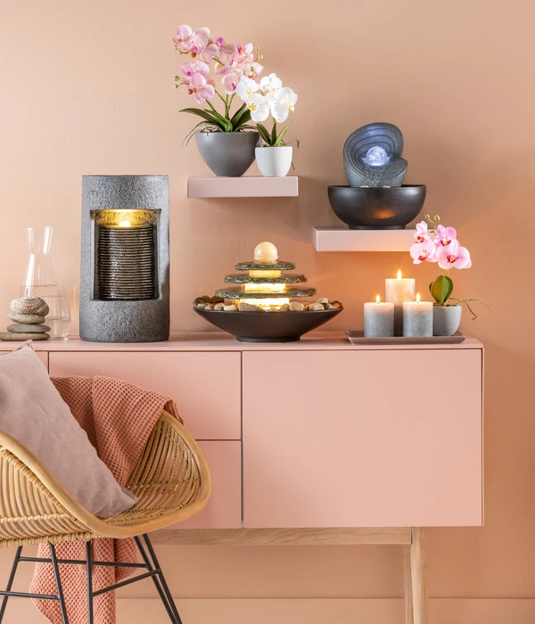 Sie schätzen Dekoobjekte, die in Ihrem Wohnraum für ein entspanntes Ambiente sorgen? Dann ist der Polyresin-Zimmerbrunnen Olua von Dehner die perfekte Ergänzung. Mit seinem runden Design, das an Wellen erinnert, erschaffen Sie sich eine kleine Oase, die Ihren Wohnraum verschönert. Die zauberhafte Kristallkugel in der Mitte des Brunnes gibt dem Accessoire einen besonders exklusiven Look, den auch Ihre Gäste bestaunen werden. Integrierte LEDs erzeugen ein erfrischendes Lichtspiel, das den Wasserfluss noch faszinierender aussehen lässt. Dank dieser schlichten, aber gleichzeitig außergewöhnlichen Optik können Sie den Zimmerbrunnen von Dehner mit jedem Wohnstil kombinieren und seinen Anblick überall genießen.