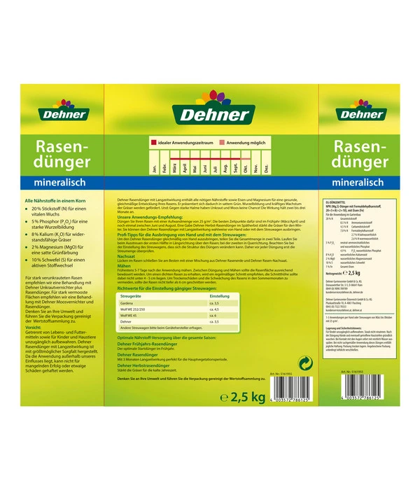 Der Dehner Rasendünger mit Langzeitwirkung kann während der gesamten Vegetationsperiode von März bis Oktober ausgebracht werden. Dank der „eingebauten“ Langzeitwirkung werden die Wirk- und Nährstoffe nur ganz langsam und in der richtigen Dosierung an den Rasen abgegeben, so dass der Dehner Rasendünger über 3 Monate lang seine Wirkung behält. Die erste Düngung erfolgt in der Regel im zeitigen Frühjahr, die zweite im Frühsommer und die letzte im Herbst, um den Rasen vor dem Winter noch mit allen wichtigen Kraftreserven zu versorgen, damit er den harten Winter gut übersteht und sich im nächsten Frühling ganz schnell wieder in seinem wunderschönen grünen Kleid präsentiert. Dank dem Dehner Rasendünger mit Langzeitwirkung.