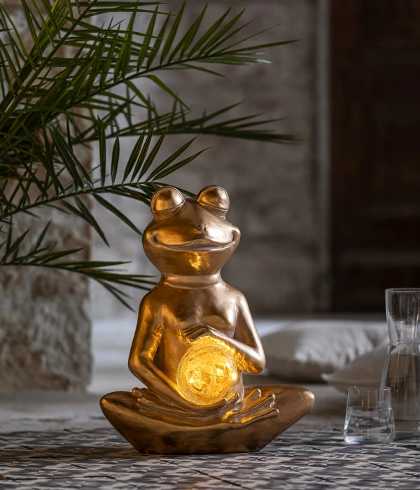 Sie haben eine Entspannungsecke in Ihrem Garten oder einen Yoga-Raum, die Sie verschönern wollen? Vielleicht möchten Sie auch Ihr Lieblingsbeet mit einem hübschen Blickfang verzieren. Der Solar Frosch Yogi von Dehner wird an vielen Orten zu einem echten Highlight. Mit seiner relaxten Körperhaltung und seinem tiefenentspannten Lächeln verbreitet er eine einzigartige Stimmung, die zum Erholen und Ausruhen einlädt. In seinen Händen hält er außerdem eine wunderschöne Kugel, die ab der Dämmerung in einem warmweißen Licht zu leuchten beginnt. Dank dieses angenehmen Effekts können Sie den Anblick des kleinen Yogi-Frosches also auch am Abend in vollen Zügen genießen.