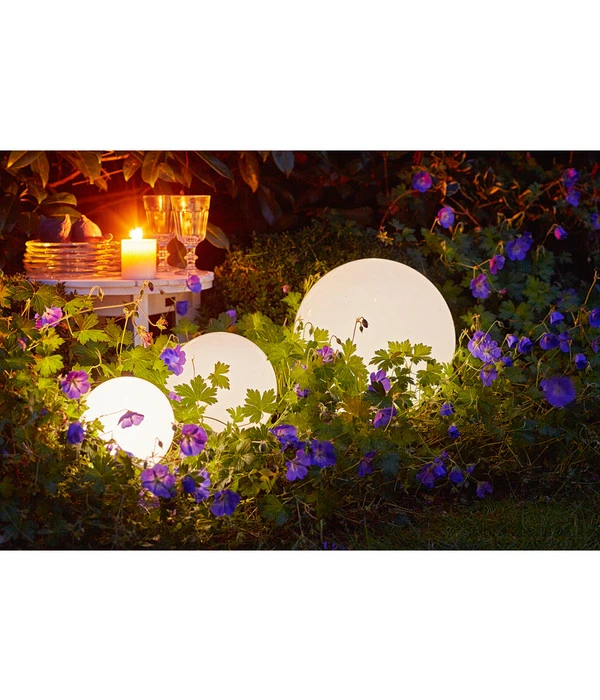 Die interessantesten Deko-Gegenstände sind die, die sich verändern und immer wieder mit tollen Effekten überraschen, finden Sie nicht auch? Zum Beispiel Deko-Objekte wie die Dehner Solar-Kugelleuchte. An manchen Abenden erhellt sie ihre Umgebung wie eine normale Außenlampe und rückt so ein Beet oder eine Buschgruppe ins Blickfeld. Ruhig und völlig unspektakulär. An anderen Abenden aber ist bei Ihnen „Party-Stimmung“ angesagt. Dann wird das gleiche Beet oder die gleiche Buschgruppe abwechselnd in blaues, grünes, rotes und weißes Licht getaucht. Sie werden immer wieder aufs Neue überrascht und fasziniert sein, wie anders die Wirkung Ihres Gartens ist, je nachdem, welche Lichtstimmung die Dehner Solar-Kugelleuchte verbreitet. Der Effekt ist natürlich besonders beeindruckend, wenn nicht nur eine Kugel Ihren Garten schmückt, sondern mehrere locker verteilt im Garten auf Ihren Einsatz warten.