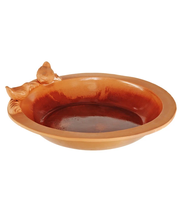 Ein toller Treffpunkt für wild lebende Vögel und eine echte Belebung für den Garten ist diese Vogeltränke, die viel Platz zum Trinken und Baden bietet. Zudem fügt sie sich mit den filigran gearbeiteten und dekorativen Vögeln am Rand ideal in Ihre Gartengestaltung ein. Die Tränke ist aus Terrakotta gefertigt und auf der Innenseite glasiert, sodass kein Wasser ins Material eindringen kann.