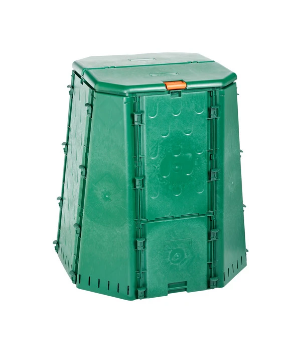 Das Sammeln von Kompost ist für jeden Gartenbesitzer selbstverständlich. Eine saubere und zeitsparende Alternative für den herkömmlichen Komposthaufen ist der Dehner Thermokomposter. So können auf einfache und preiswerte Art die anfallenden Garten- und Küchenabfälle nutzbringend verwertet werden. Aus den Abfällen entsteht durch die Wärmeentwicklung im Inneren des Thermokomposters rasch wertvoller Humus, der als Dünger für Gemüse- und Blumenbeete verwendet werden kann und das gesunde Wachstum der Pflanzen fördert. Der Dehner Thermokomposter für den Garten ist besonders bei kleinen Gärten zu empfehlen, da er platzsparend in jedes Garteneckchen passt und unangenehme Fäulnisgerüche, die bei einem freien Komposthaufen gelegentlich auftreten, verhindert. Er verfügt über ein Aktivbelüftungssystem mit Wandlamellen, die für eine schnellere Umwandlung der Abfälle in Humus sorgen. Der Thermokomposter besteht für den bequemen Transport aus einzelnen Kunststoffteilen, die einfach zu montieren sind. Der Deckel ist mit einem Klickgriff leicht zu öffnen. Die Reinigung des Dehner Thermokomposters für den Garten ist mit einem Gartenschlauch kinderleicht und in wenigen Minuten erledigt.