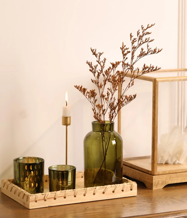 Tablett B30/H2,5/T20 cm, Vase Ø10/H18,5 cm, 1. Windlicht Ø8/H9 cm, 2. Windlicht Ø7/H8 cm, Kerzenhalter Ø9/H19,4 cm