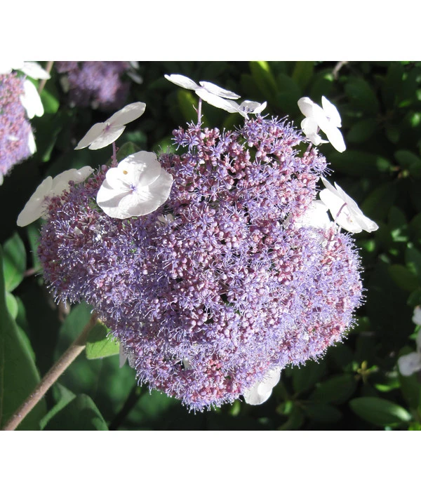 Wow! So eine exotische Pflanze wird Ihren Garten in eine wunderschöne Traumlandschaft verwandeln. Die dunkelgrünen, großen Blätter sind mit einem zartem Flaum belegt, welcher die Pflanze kuschelig wirken lässt. So weich und samtig, dass Sie sich am liebsten hinein legen möchten. An dieser Hortensie bleibt jeder gerne stehen, um sie ausgiebig zu betrachten. Vor allem während der Blütezeit kann sie nochmal richtig punkten. Sie blüht zwar nicht so reichhaltig, wie andere Hortensien-Arten, dafür aber umso schöner. Die Blüten sehen aus wie kleine, runde Kissen, was den Traumlook perfekt abrundet. Die äußeren Blüten sind cremeweiß und werden hellgrün, wenn sie verblühen. Diese Blüten bilden einen Kranz um viele kleine kräftig, lilafarbene Blüten. Ein einzigartiges Farbspiel wird sich Ihnen bieten! Und diese Pracht kann man kaum übersehen, denn die Blüten sind circa 30 cm groß.