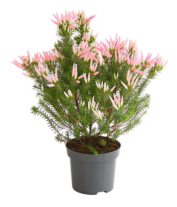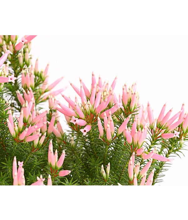 Wussten Sie, dass es weltweit über 800 Erikasorten gibt, also Heidekrautpflanzen, die in nahezu allen Klimazonen zu finden sind und ganze Landstriche prägen? Und inmitten dieser schier unübersehbaren Fülle gibt es immer wieder Sorten, die unsere besondere Aufmerksamkeit verdienen, weil schon ein einzelnes Pflänzchen einen ganz eigenen Charme versprüht. Schauen Sie sich nur einmal diese Wachsheide an. Sie stammt ursprünglich aus Südafrika und begeistert durch ihre außergewöhnliche Blütenform im Zusammenspiel mit dem leuchtenden Rosa ihrer Blüten. Und diesen Blütenschmuck kann man sogar richtig schön lange bewundern, nämlich von März bis in den Juni hinein! Die Wachsheide-Pflänzchen haben einen aufrechten Wuchs, ihre Blätter sind immergrün, dunkellaubig und quirlständig angeordnet.